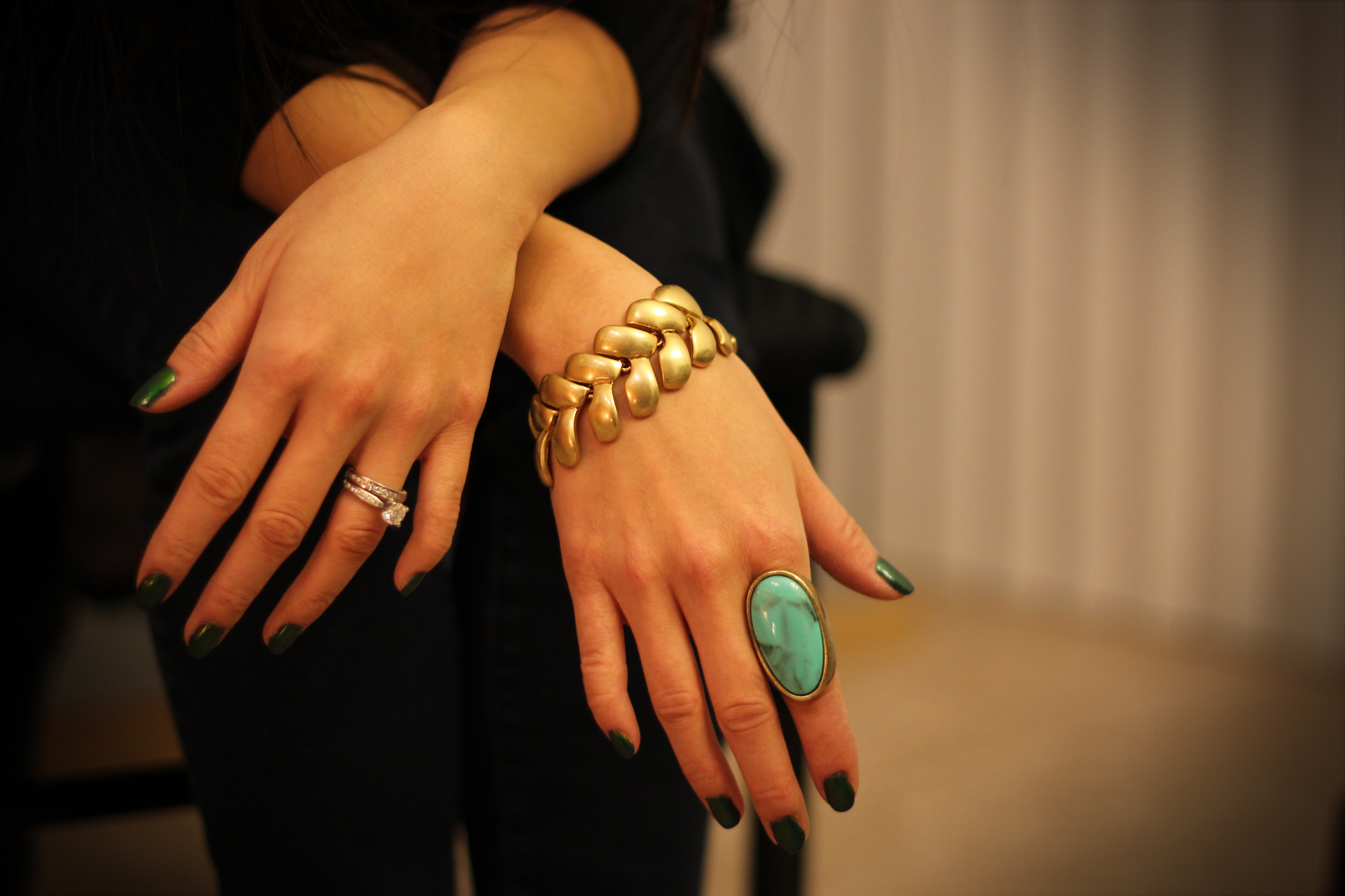 I love how the emerald-green polish and antique gold bracelet are perfect complements. The gold adds a touch of elegance and brings out the richness and vibrancy of the green. I think these colors are perfect for winter and could also be great wedding colors! I would wear these two items with earth-tone colors (like browns and dark beige) and turquoise blue.