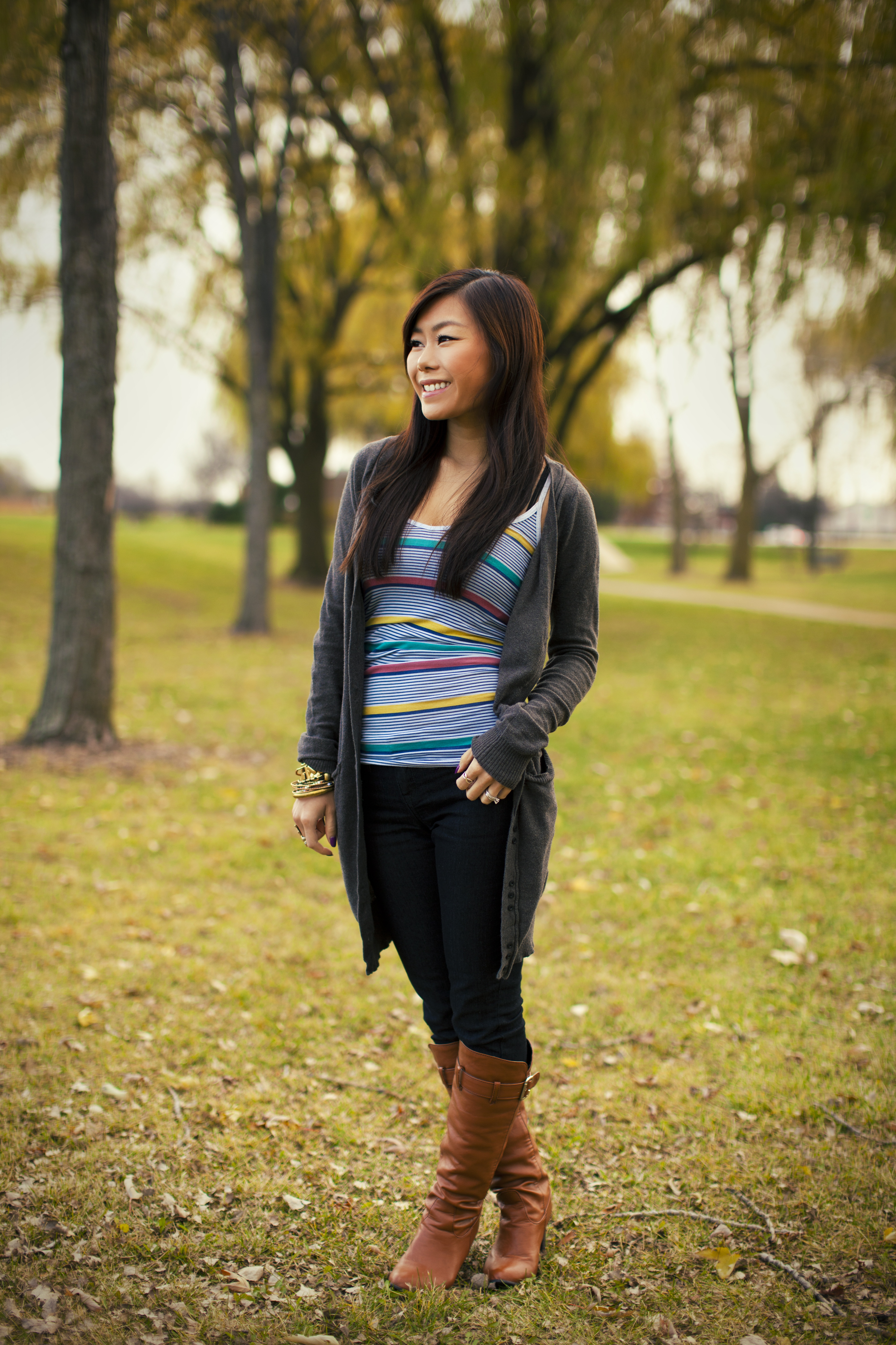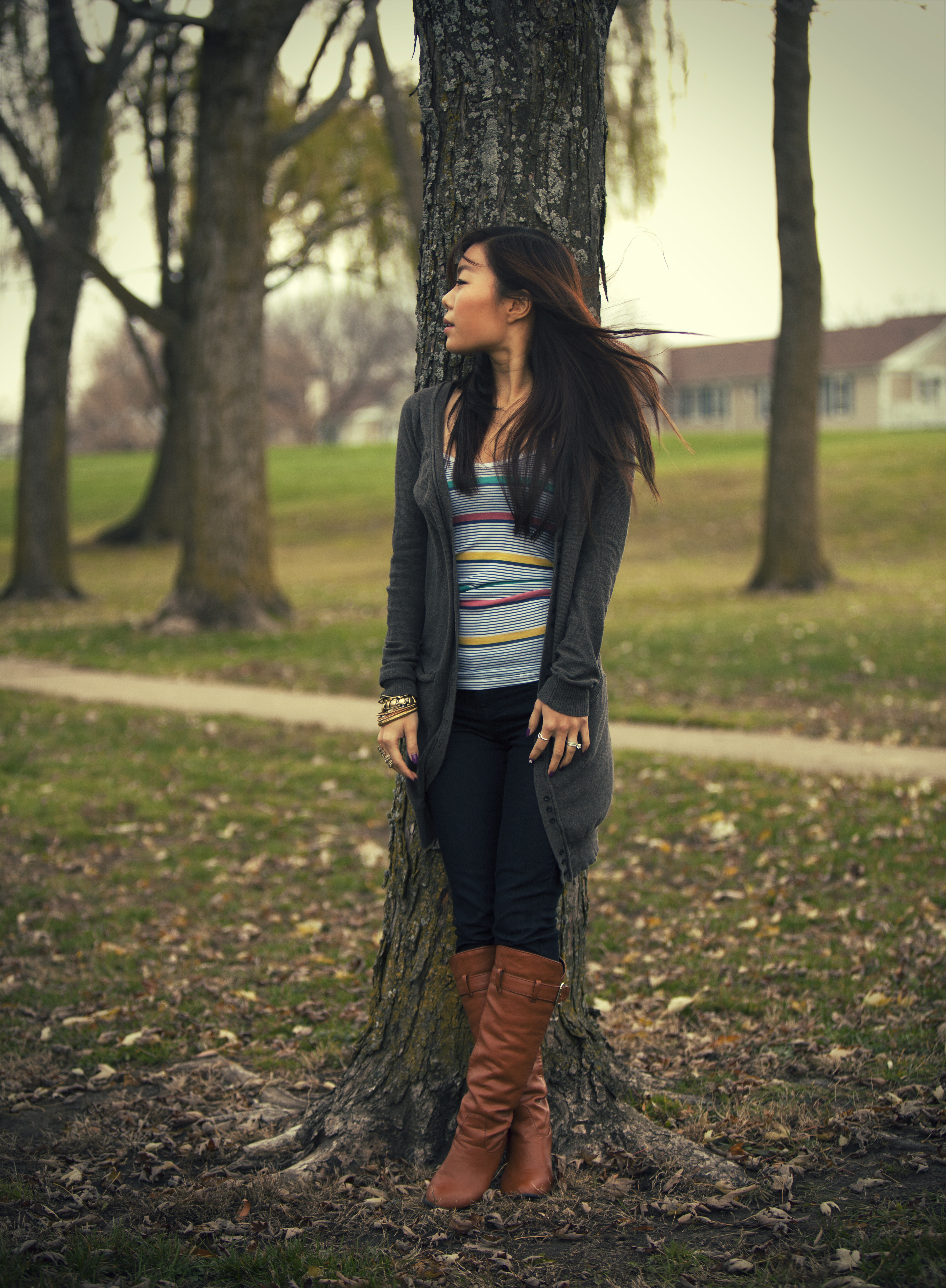 Today, I paired a fitted striped tank with a knit cardigan, jeans, and camel-colored boots. Since I am petite AND curvy, it is hard to find knit sweaters and cardigans that don’t overwhelm my size, which is why I love to pair them with a tight fitted tank or tee underneath and tight fitted pants. I also wore some gold and neutral-colored bracelets.